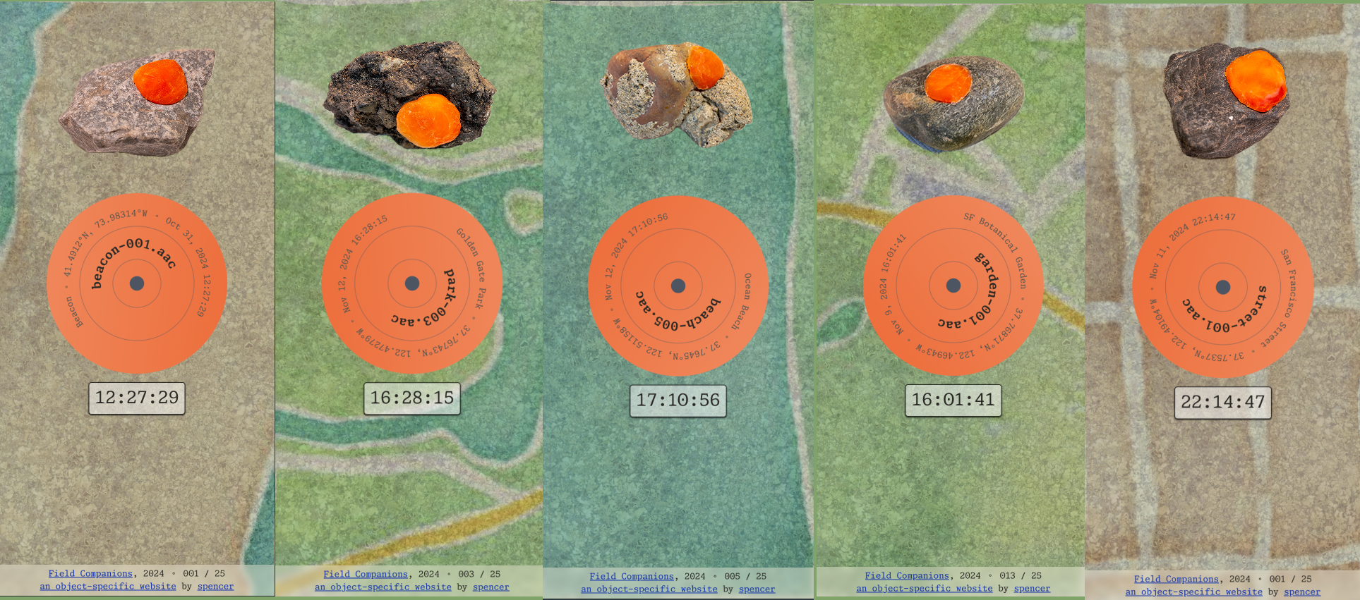 Each found object has had a portion carved out and replaced with a "soul" containing a 1-minute audio memory from its location. Touching your phone to the Companion's soul initiates a web experience with a coordinate-specific animated background that shifts with the audio memory. Every Companion is sourced, carved, molded, and finished by hand and completely unique, featuring a distinct sculptural form and digital soundscape, which can only be accessed by interacting with its physical body.